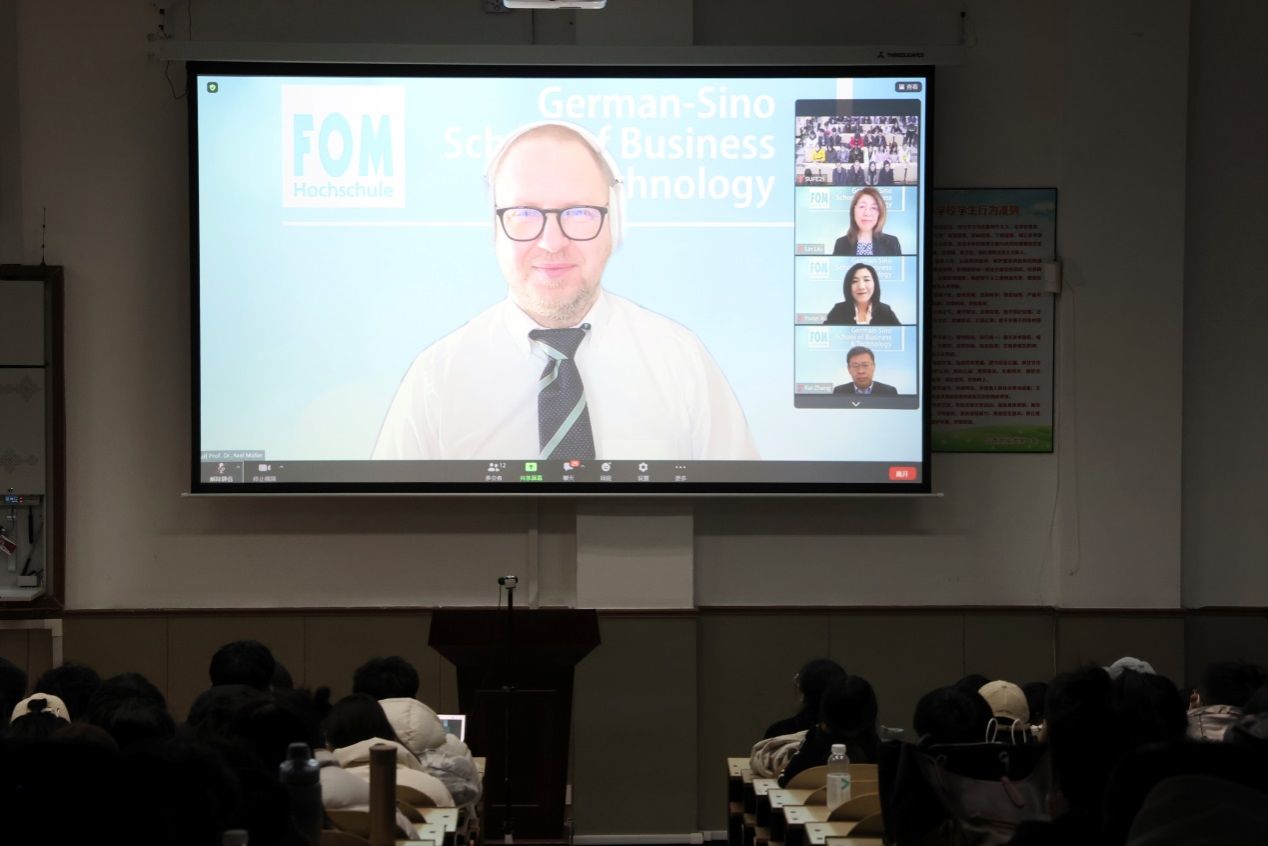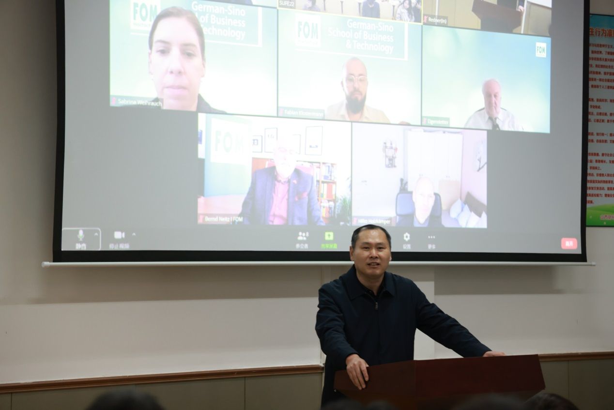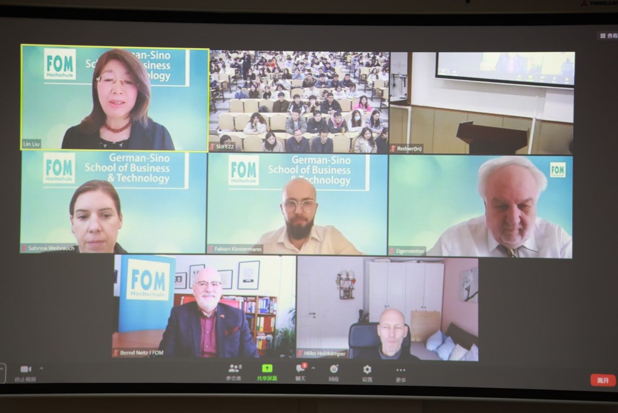 2月27日,3月1日中国时间下午18:00,我院分别为学院2021级、2020级学生举办新学期开课仪式。FOM大学德中经济科技学院院长Liu Lin女士、教学院长Axel Müller教授、教务主任Rainer Eigenstetter教授及本学期所有德方任课教师、助教、中方辅导员与同学们相聚“云”端,我院党委书记刘臣洲、院长史贞、副书记郭建军、副院长陈啸、王秀娟出席开课仪式并讲话。本次开课仪式由副院长王秀娟主持。