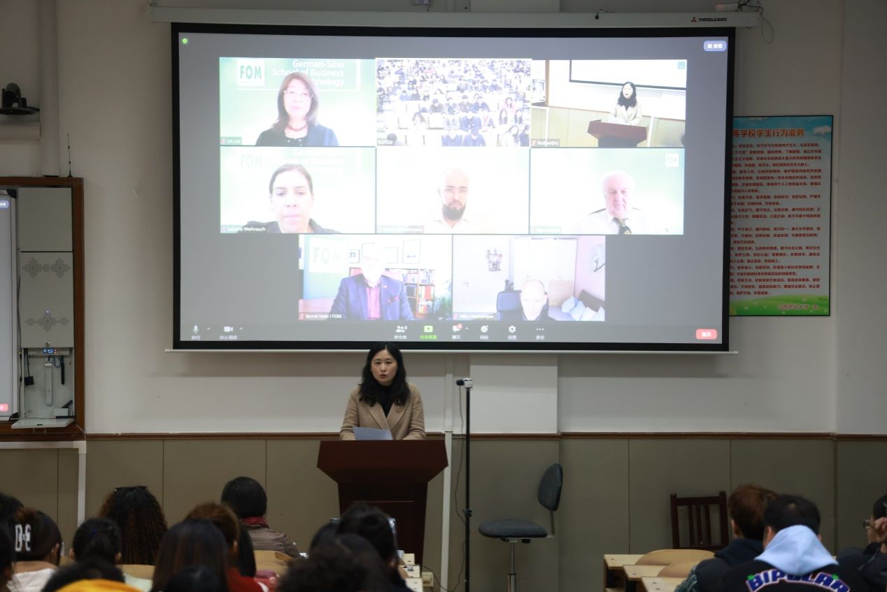 院长史贞首先代表学院讲话,她表示,虽然疫情暂时阻止了德国教授到中国的脚步,但阻挡不了各位德国教师的上课热情和同学们汲取知识的渴望。希望德国教授一如既往地发挥教书育人的崇高精神,将最先进的学习方法和最前沿的理论知识讲授给必威西汉姆联的学生们,帮助同学们完善专业知识、提高学习能力、塑造卓越人格,为进入德国FOM大学主修阶段学习奠定基础。希望同学们合理规划学习时间,优化学习方法,将专业知识的学习与德语语言的强化融会贯通,以财经类的视角去分析和规划自己的人生,做一个肩负社会责任、肩负时代使命的大学生。