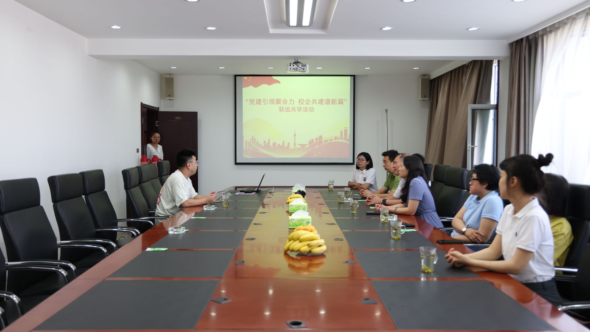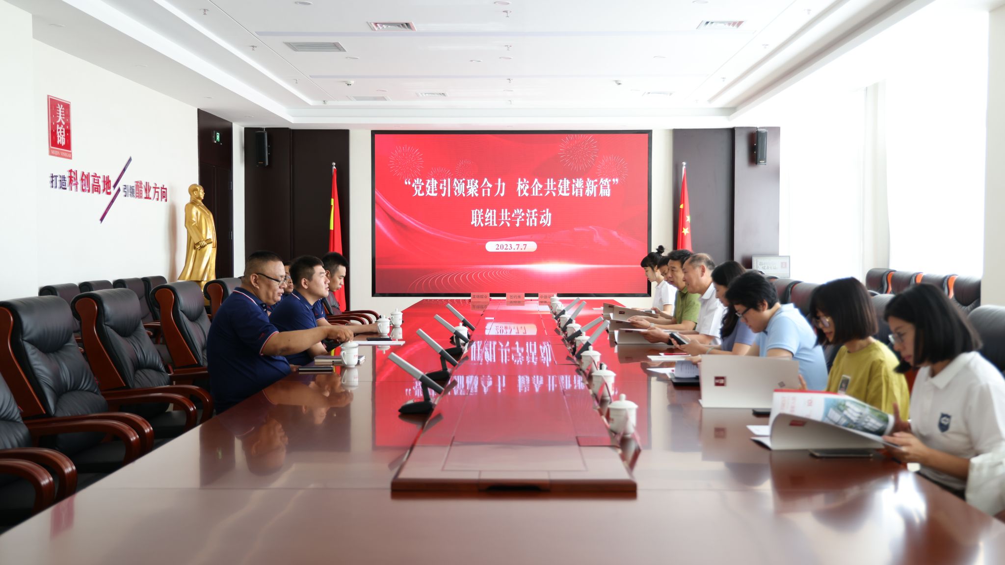 刘臣洲书记一行8人首先来到位于清徐的山西美锦醋业有限公司,观看了企业宣传片,通过企业沙盘了解了美锦醋业的发展规划、远景目标、建设运营等情况。随后进行了联组共学、校企合作、实践教学基地共建座谈会。刘臣洲书记简要介绍了学院学习贯彻习近平新时代中国特色社会主义思想主题教育的开展情况,特别是围绕“重实践”就加强学生德语学习帮扶、赴德学习签证辅导培训等主要做法及学习成效以及如何加强企业党建与学院党建的共建同创进行了深度交流。郭建军副书记以“党建工作和校企合作的发展路径”为题从加强党员思政教育、业务学习与实践锻炼、党建工作与校企合作的组织协调、信息共享、校企合作宣传推介等五个方面作了交流发言。姚锦涛董事长就学生实习实训、企业发展亟须的人才、人才培养与企业需要的结合、企业党建及吸纳优秀人才加盟等方面与学院参访人员进行了深入探讨并提出了今后合作的思路。