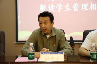 党委副书记郭建军解读学生管理相关内容。他在强调学校和学院的规则制度的同时,建议全体新生能够科学合理的管理自己,加强自我管理以及自我约束。合理规划时间,保持良好的生活作息,努力学习、积极参加文体活动,全面发展。