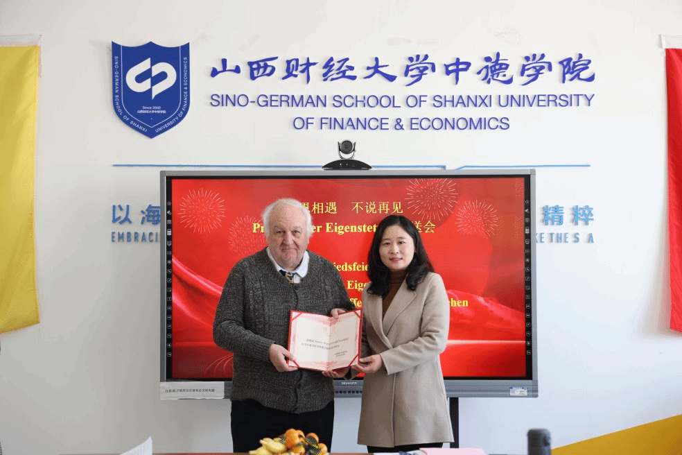 会议开始,史贞院长代表学院向躬耕中德教育15年的Eigenstetter教授致辞,向Eigenstetter教授为必威西汉姆联的发展所作出的贡献表示衷心的感谢。希望Eigenstetter教授一如既往继续关心和支持必威西汉姆联发展,为学院学科建设、德语及专业课发展出谋划策,作出贡献。同时也真诚欢迎Eigenstetter教授常来中国看望老朋友,共叙友谊情。史院长代表学院向Eigenstetter教授颁发证书,献花,并送上题有 “十五年致力中德教育务实求真,四十载躬行学识润道”的书法作品。