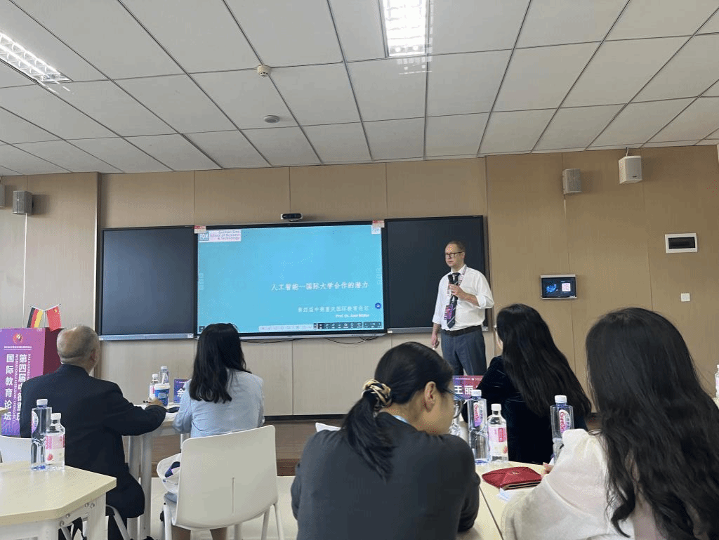 本次论坛还设置4个专题分论坛,包括德国专业认证与中国应用型大学内涵建设;人工智能在专业教育中的应用与挑战;人工智能时代背景下的中外合作办学:影响、创新与前景及乘AI时代之势,构建产教融合新格局论坛等主题。我院德方教学院长Axel Müller教授在论坛做了题目“人工智能---国际大学合作的潜力”报告分享,报告内容受到与会专家学者高度认可。