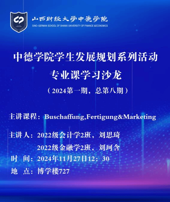 为帮助学生深入领会和全面掌握德语及专业课知识,提升学生专业学习能力,11月27日中午,我院2024年第一期专业课程沙龙在博学楼727教室成功举办。本次专业课程沙龙主讲人为2022级会计学2班刘思琦、金融学2班刘珂含同学,她们针对《Buschaffung,Fertigung &Marketing》课程特点,对课程内容进行了梳理,将课程重点难点进行了讲授,将总结的学习方法进行了分享。2023级80多名同学参加了本次沙龙。