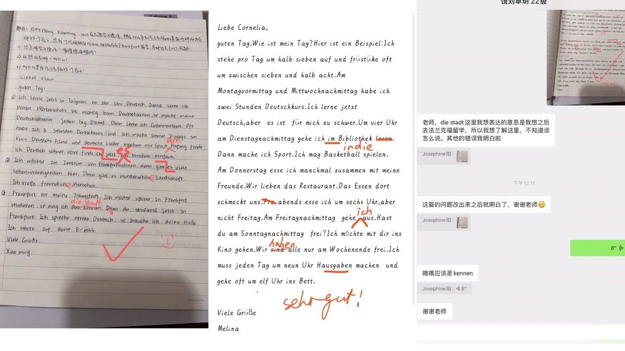 另外,来自大二大三的助教学姐在德语学习上也给了同学们很大的帮助,每天晚自习开始前我都会和助教们说一下今天复习内容的重点,以及哪位同学的发音需要她们帮忙纠正,在她们的监督和协助下,大家学习效率和效果都有了明显的提升。