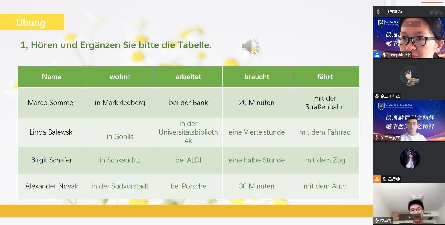 每天开始德语教学前,我会把本周已经学过的单词听力给同学们播放一次,要求所有同学开摄像头跟读,营造良好的德语学习的氛围,也提高了学生发音的准确性。