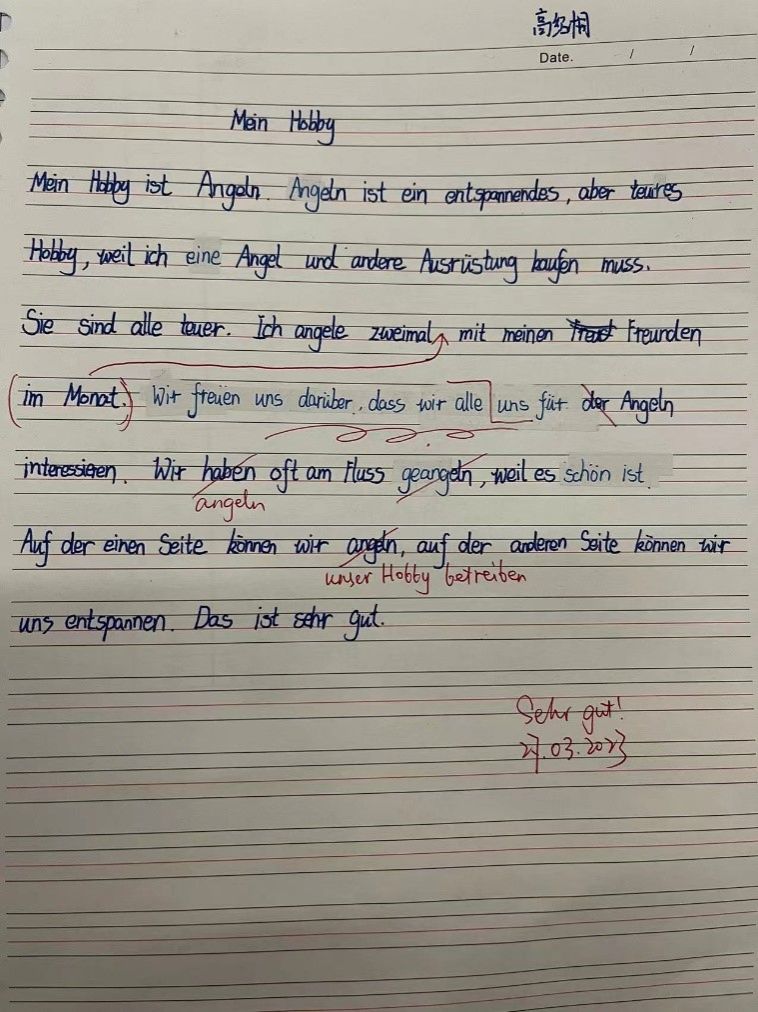 我班在每个单元学习结束后都要求背诵一篇课文,四单元背诵的课文是第二部分关于业余时间的调查。背诵文章之后,以举例的方式告诉学生如何把背诵的课文转化为自己的句子和作文,学生掌握方法,逐渐运用到自己的口语和写作中,逐步提高自己的德语表达能力和水平。