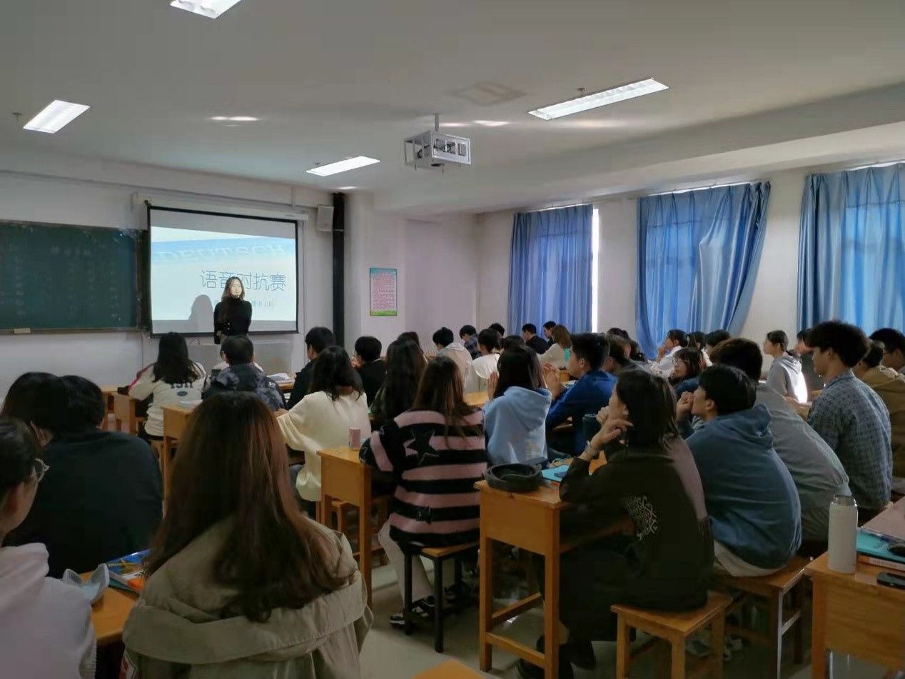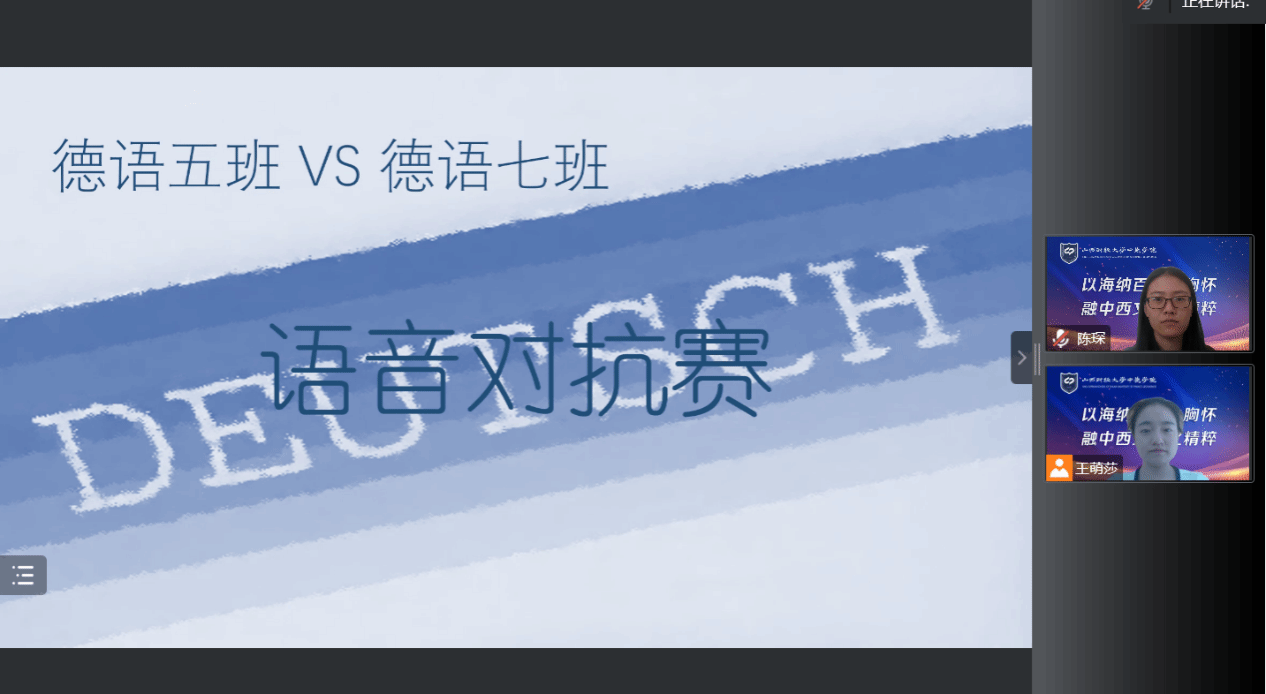 根据进度安排,教学第一周、第二周为语音学习阶段,为测试本阶段学习效果,使同学们相互了解、共同进步,陈琛老师、王萌莎老师带领德语五班,德语七班于2022年10月21日开展了一场别开生面的语音对抗赛,五班、七班共50名同学参与其中,两位老师线上指导。