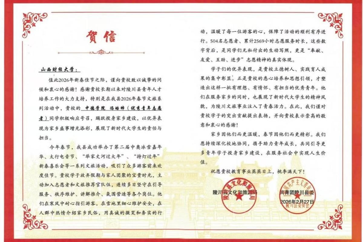 近日,必威西汉姆联收到来自山西省陵川县的一封贺信,信中高度赞扬了我院2025级中德会计学2班学生冯皓帅,在寒假期间积极投身家乡志愿服务、助力新春文旅系列活动中的优异表现。