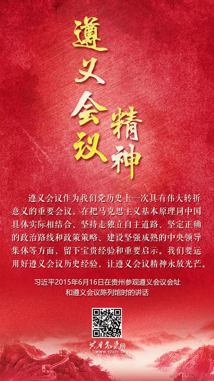 2015年6月16日,习近平总书记在参观遵义会议会址和遵义会议陈列馆时指出,遵义会议作为我们党历史上一次具有伟大转折意义的重要会议,在把马克思主义基本原理同中国具体实际相结合、坚持走独立自主道路、坚定正确的政治路线和政策策略、建设坚强成熟的中央领导集体等方面,留下宝贵经验和重要启示。